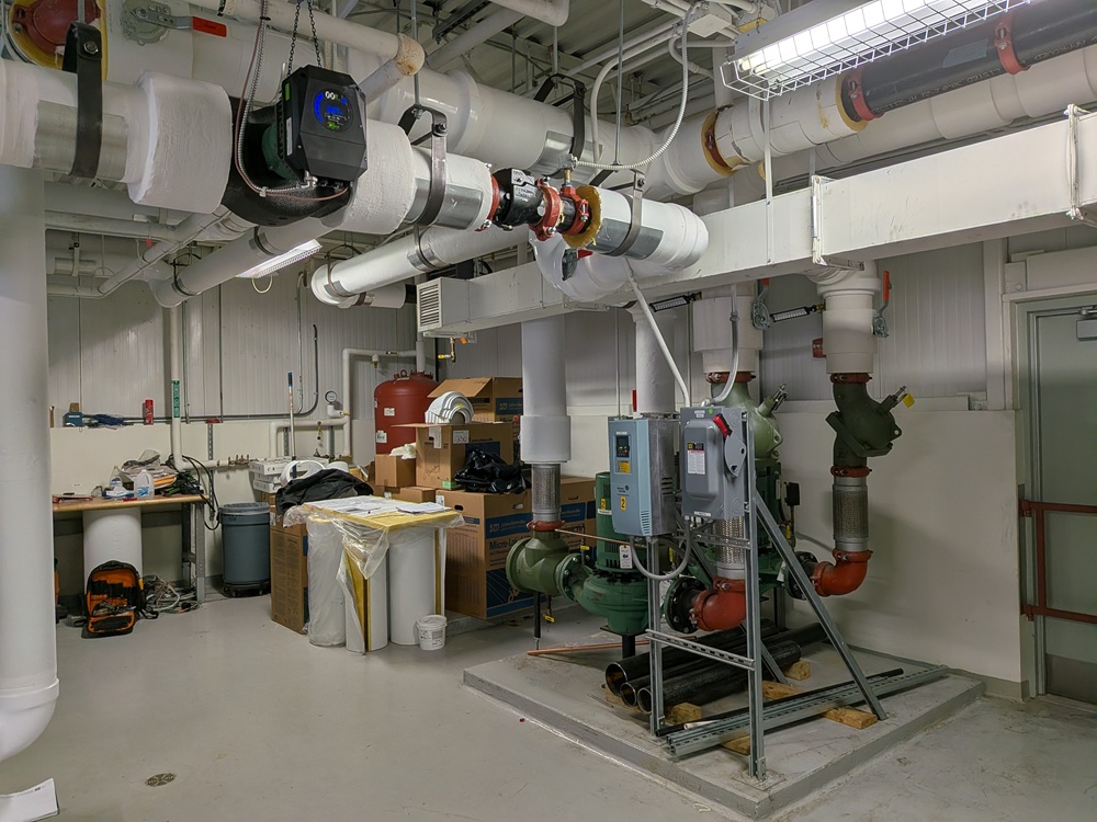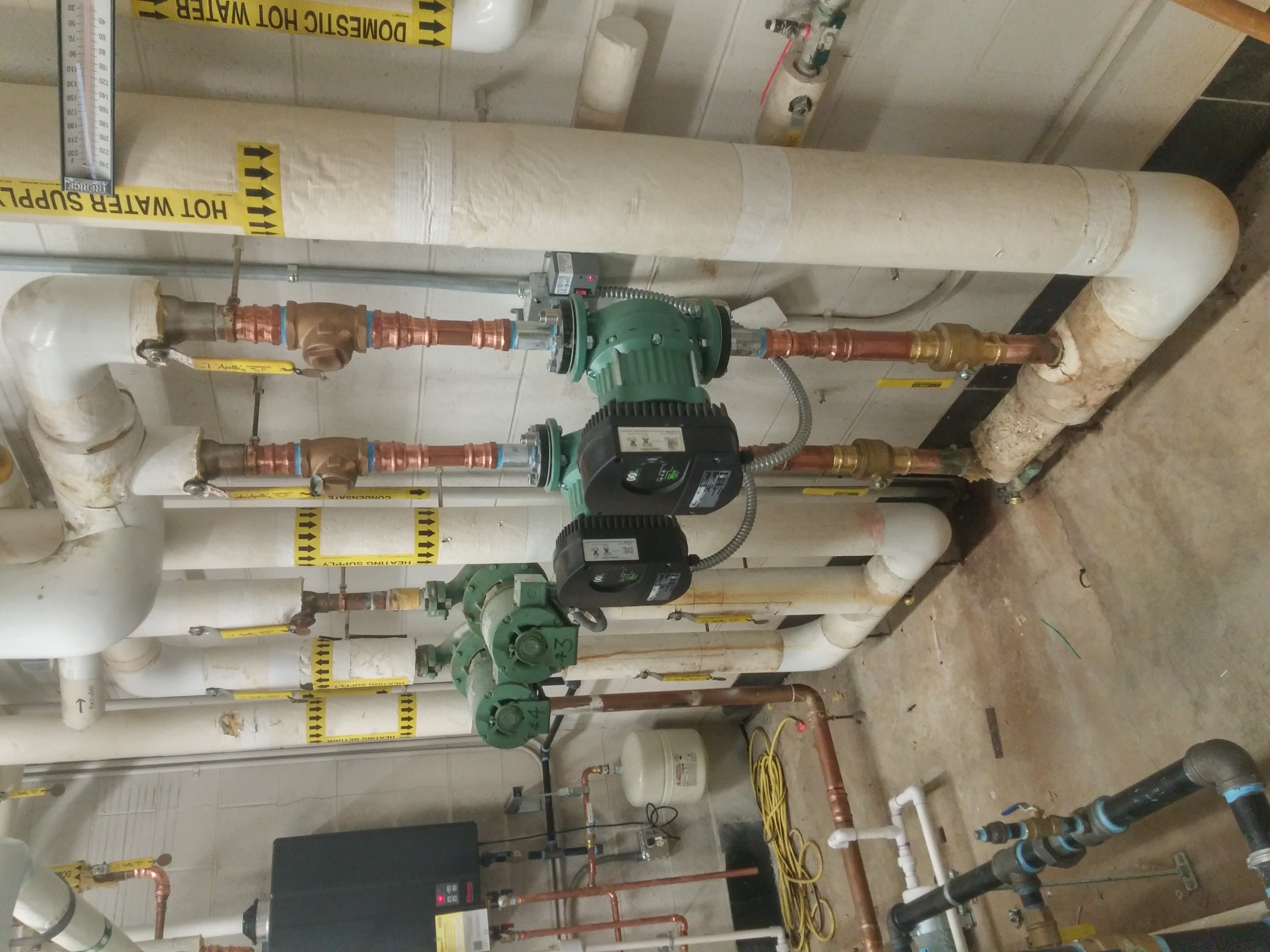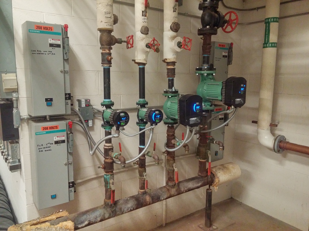 Another photo from the Barnes ANGB showing the pumps in building 55, two of which are new ECM. The in-floor radiant heating pumps stayed.