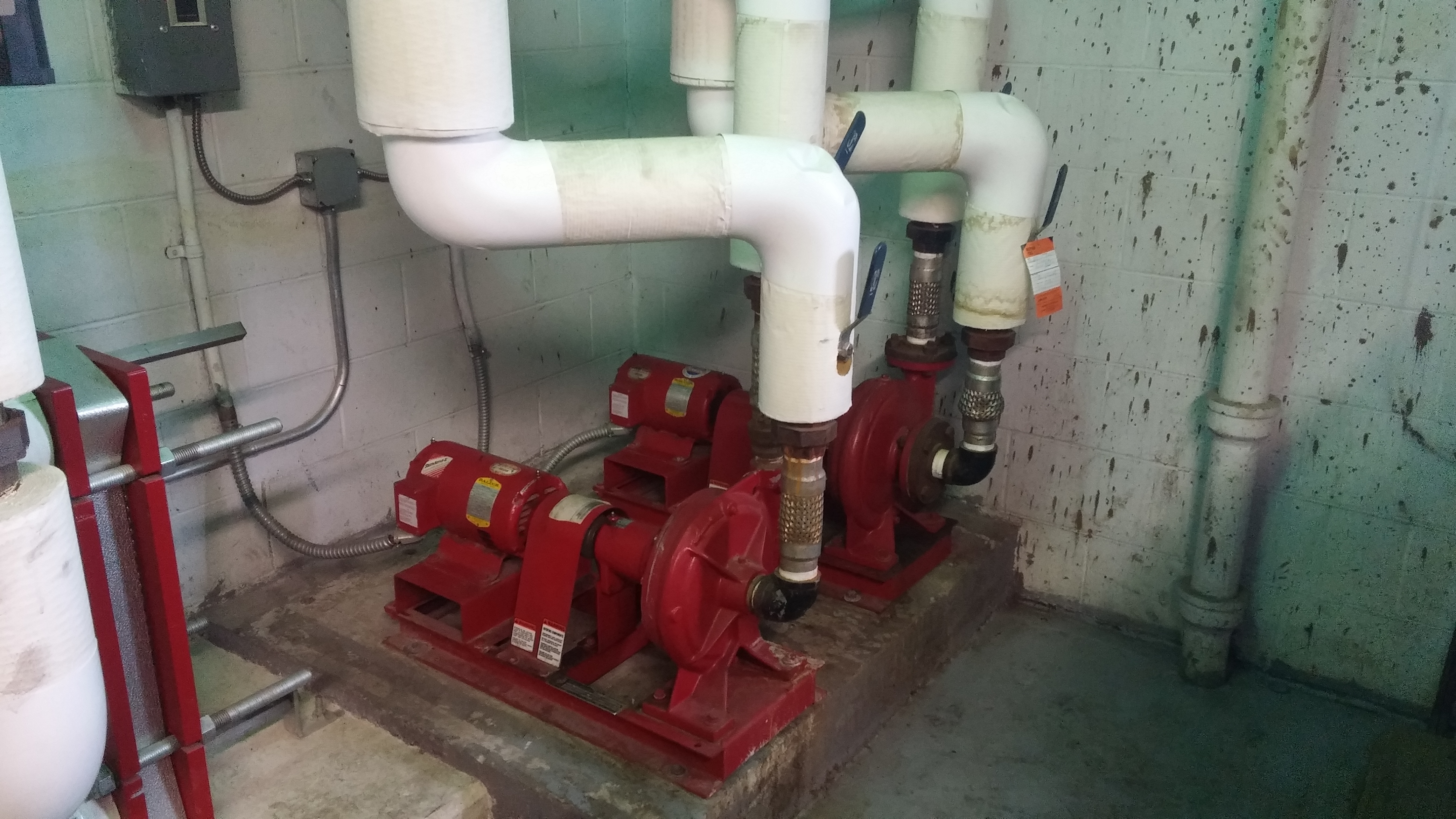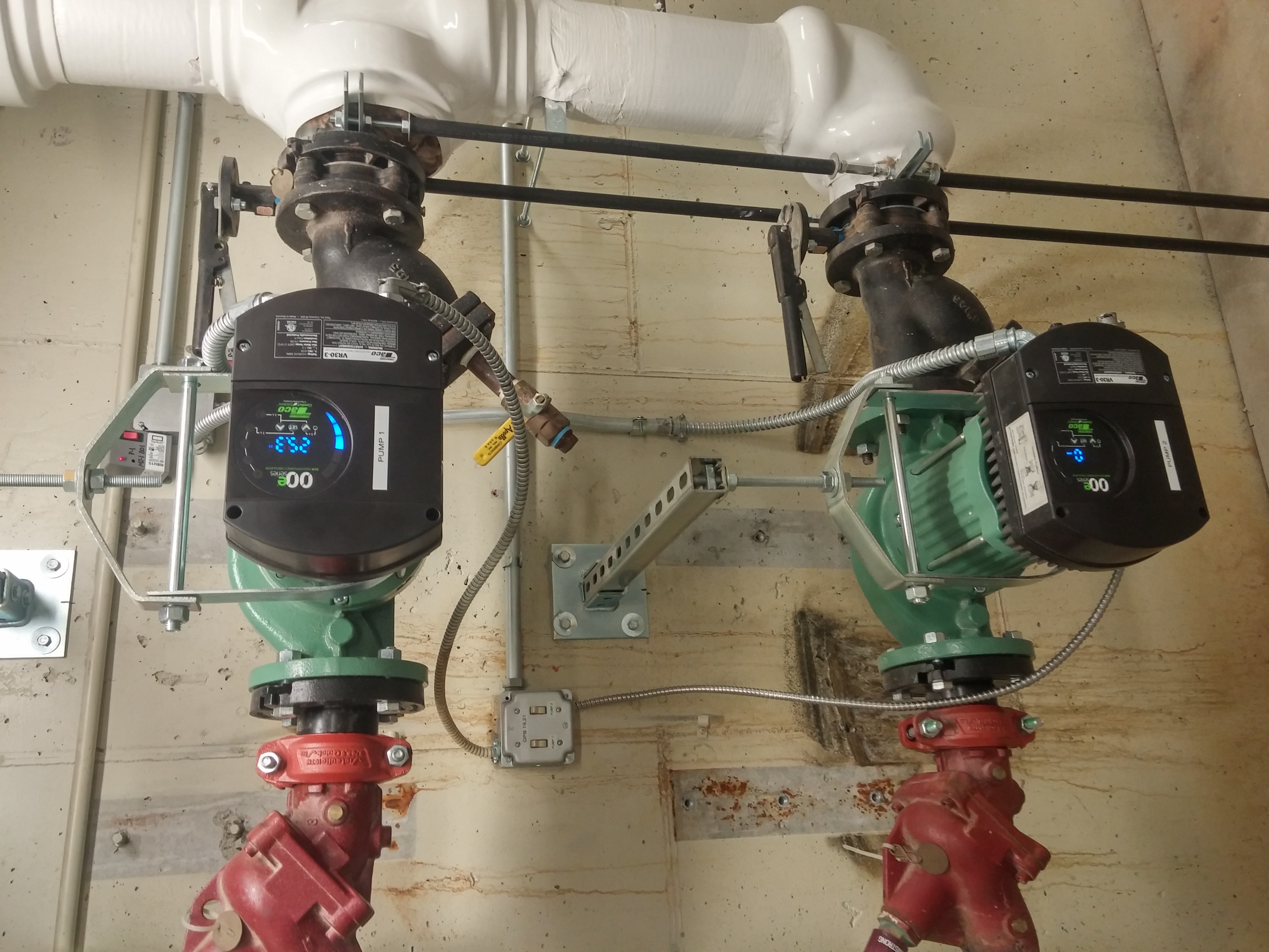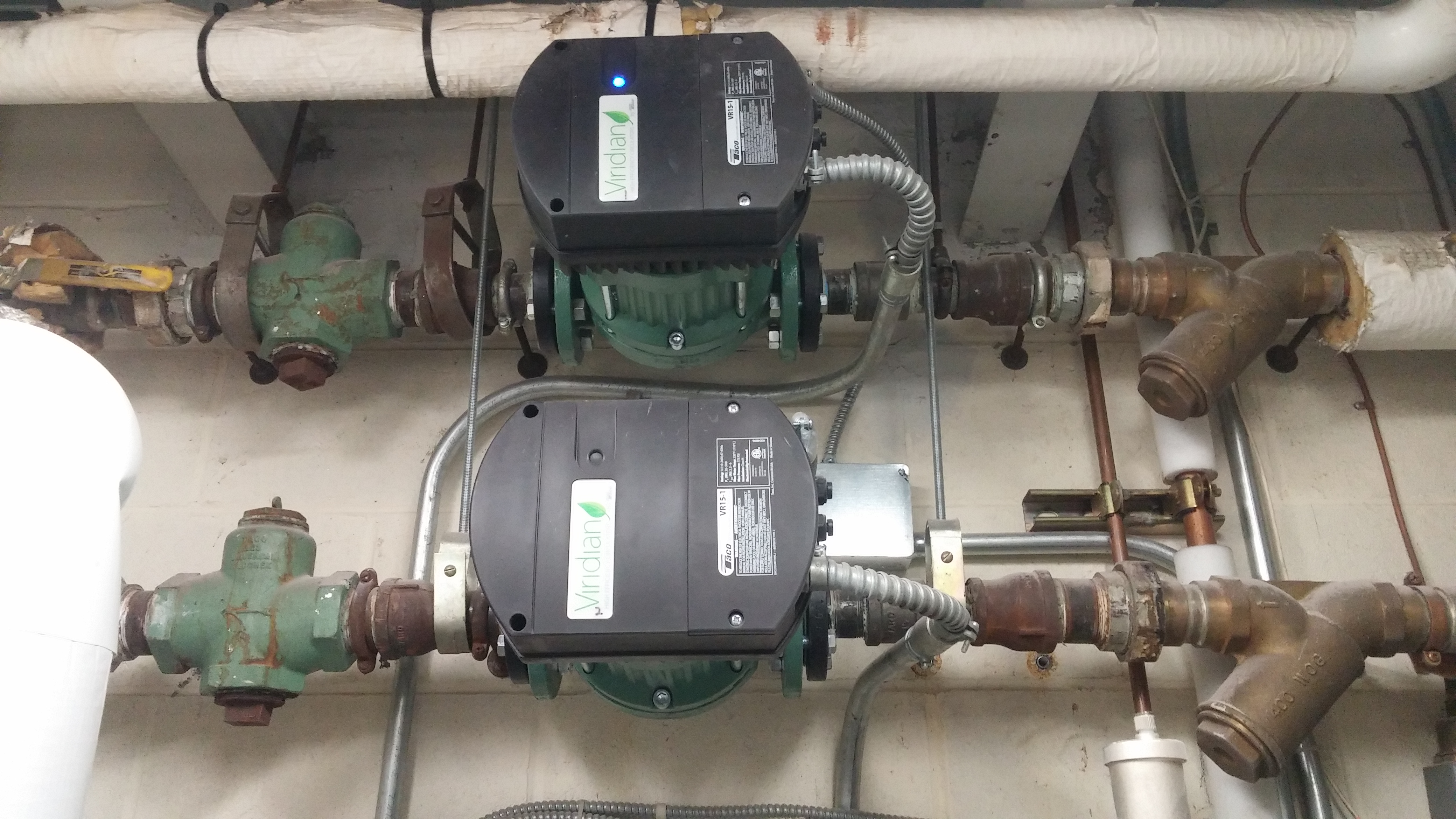 Another photo from the Barnes ANGB showing the pumps in building 55, two of which are new ECM. The in-floor radiant heating pumps stayed.